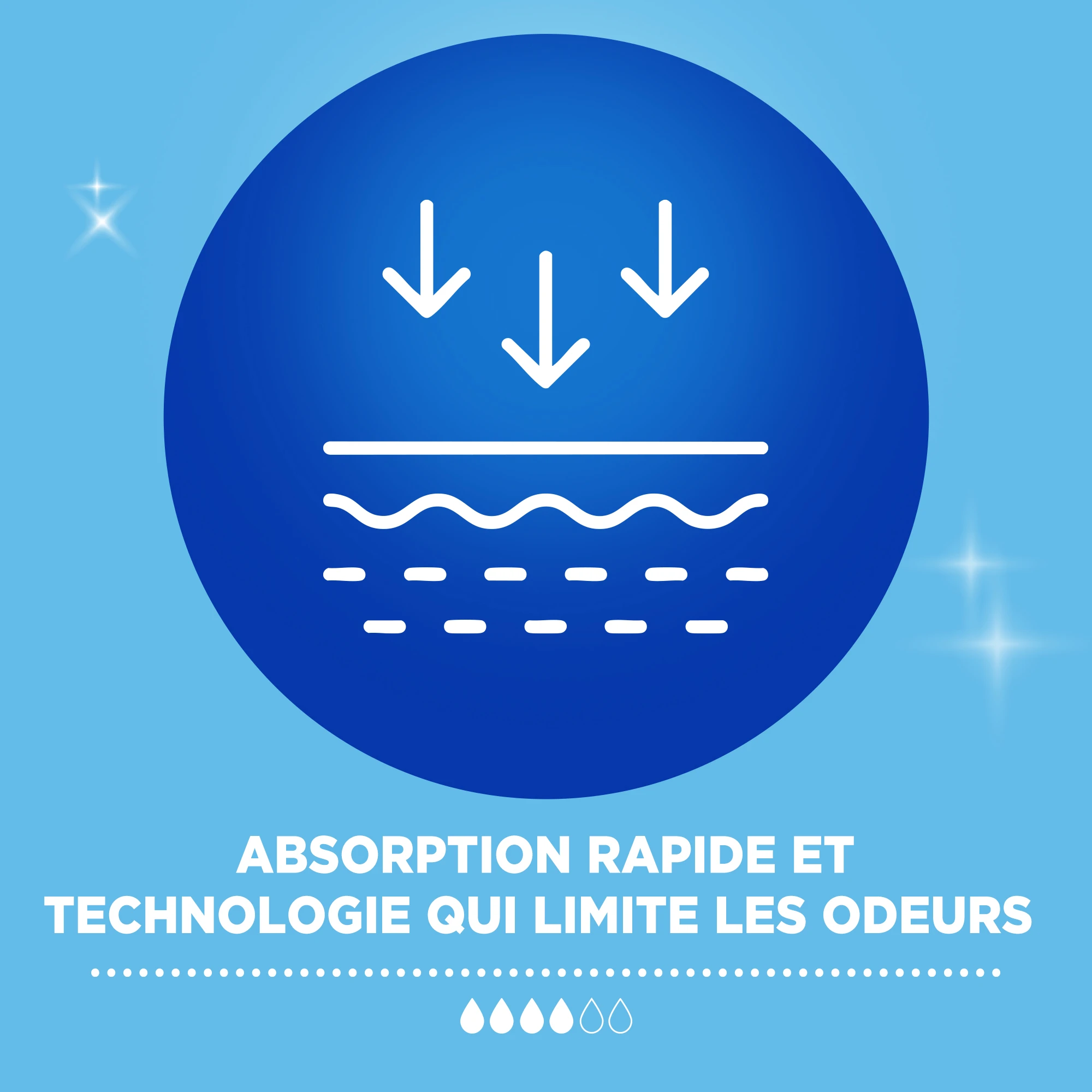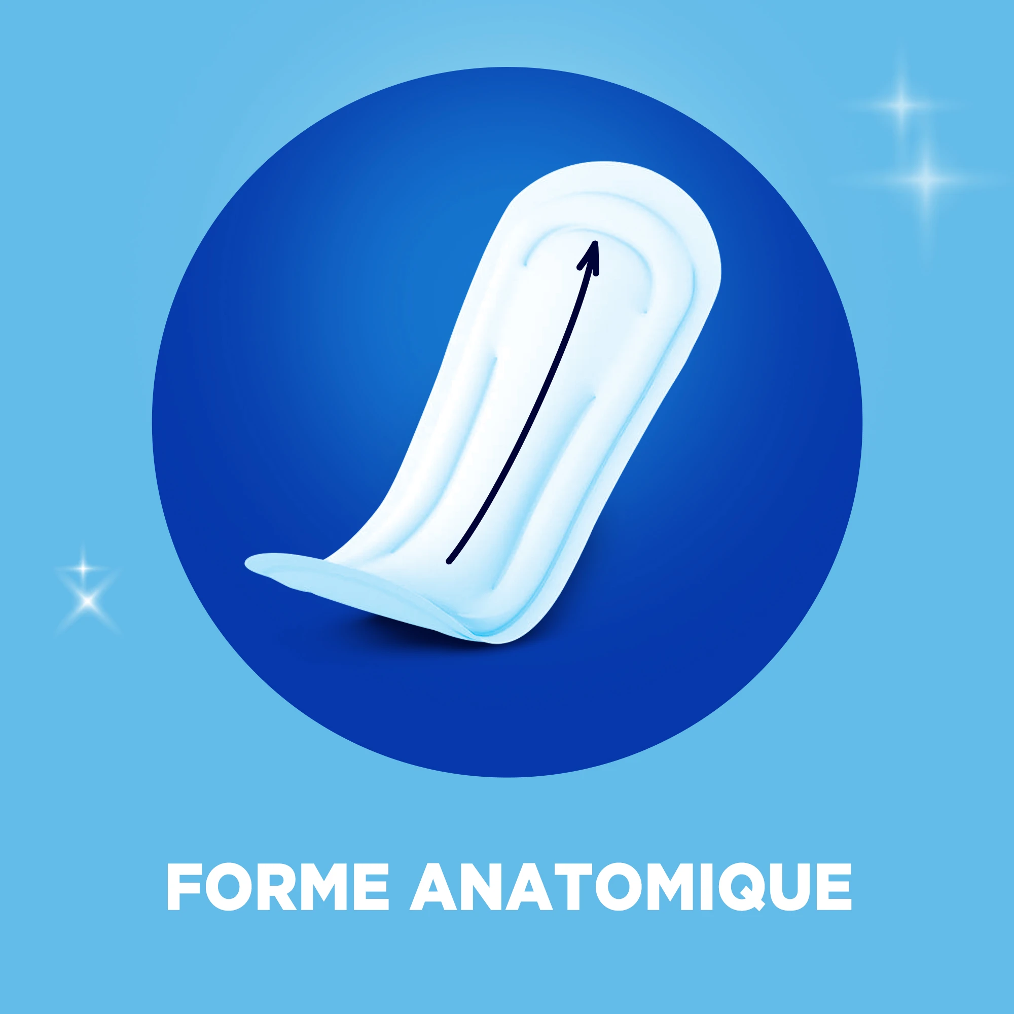 *Basé sur les performances d’absorption des serviettes et sur les données moyennes de flux menstruel, considérant que les serviettes sont changées régulièrement.